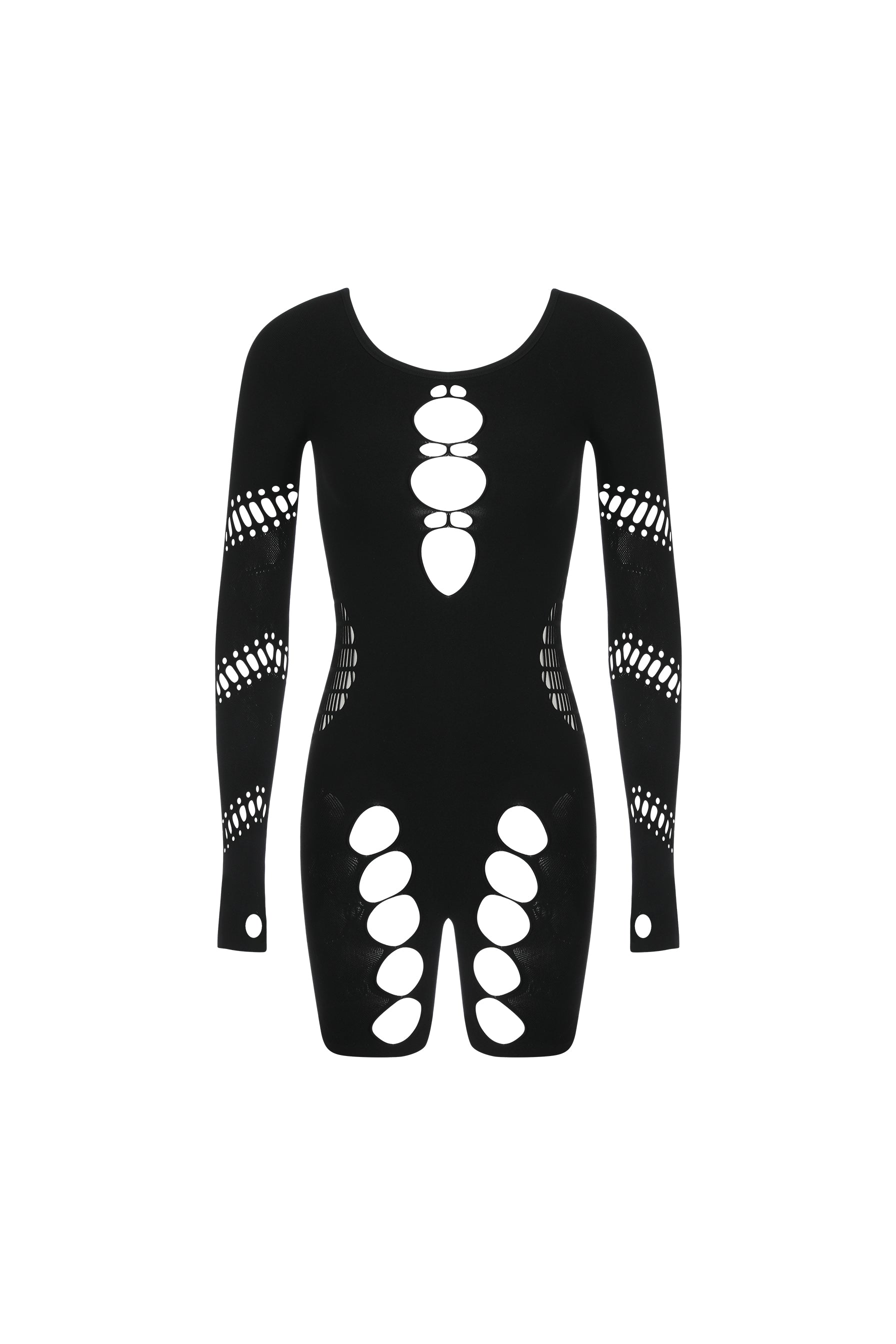 Honeyed Blade bodysuit embodies poetic duality—where delicate allure meets structured elegance. Crafted from sheer black lace and whisper-light mesh, its bateau neckline frames the collarbone with refined grace, while the sleek silhouette traces the body’s natural lines like a whispered sonnet. The interplay of transparency and restraint evokes a narrative of tender tension, where softness conceals subtle audacity. Designed for those who cherish contrast, this piece transforms intimacy into an art of nuanced expression